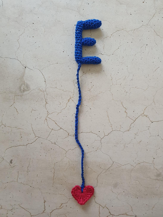 Buchstaben "E" mit Herz, blau/rot (E 4 x 6 cm, Herz 3.5 x 3 cm, Schnurlänge 20.5 cm)