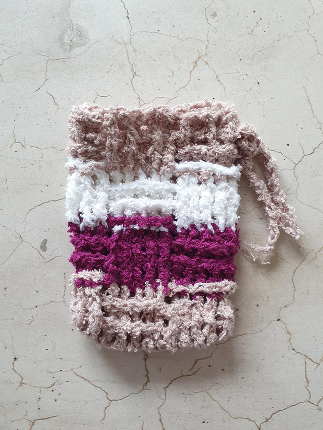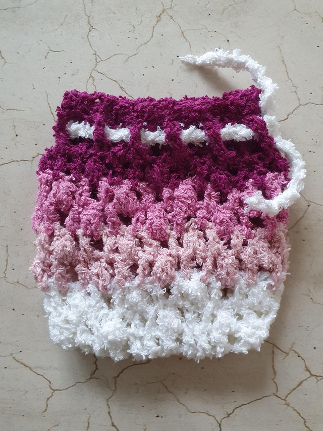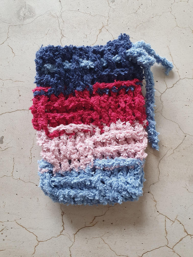 Es sind Unikate und aus Woolly Hugs Frottee, 100 % Baumwolle, gehäkelt.