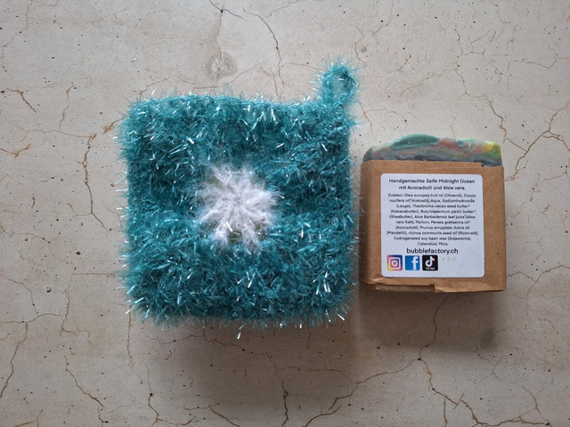 Set Midnight Ocran: Seifensäckchen Margeriten, türkis/weiss/gelb (11 x 10 cm, 2-lagig) mit Seife Midnight Ocean von Bubble factory aus Schaffhausen
