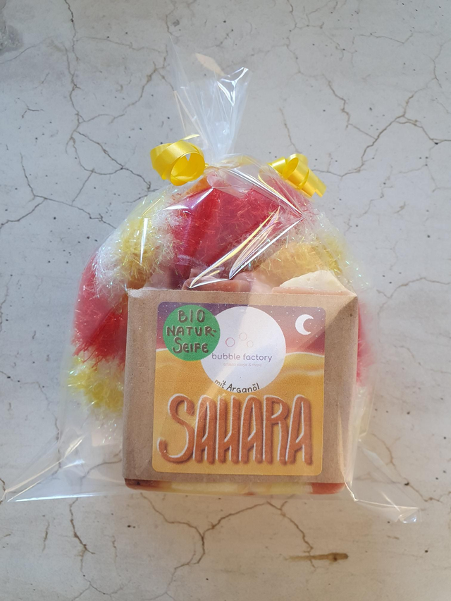Set Sahara; Schwamm Candy, rot/weiss m. glitzer/gelb (Durchm. 11 cm, 2-lagig) mit Seife SAHARA von Bubble factory aus Schaffhausen