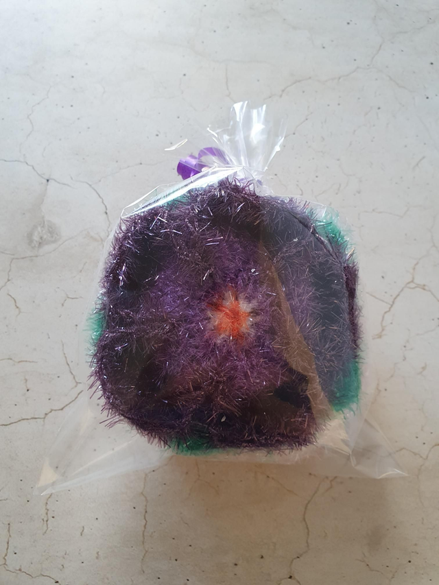 Der Schwamm ist ein Unikat und aus Bubble Garn, 100 % Polyester gehäkelt.