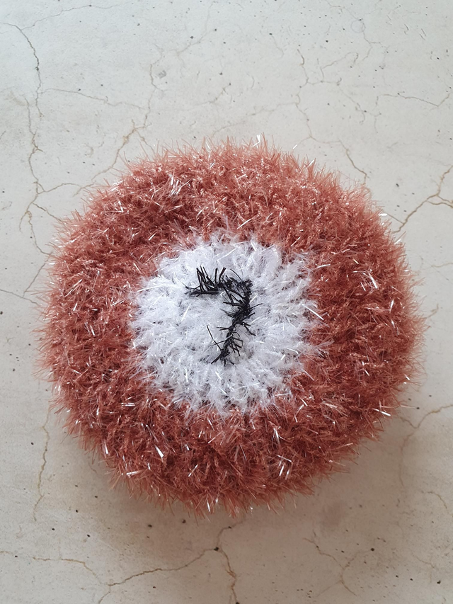 Es ist ein Unikat, der Schwamm gehäkelt aus Bubble Garn, 100 % Polyester, und die Topflappen aus Tissa Garn von Lang, 100 % Baumwolle