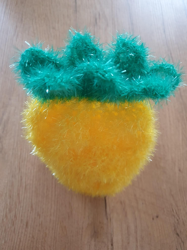 Jeder Schwamm ist ein Unikat und aus Bubble Garn, 100 % Polyester, gehäkelt.