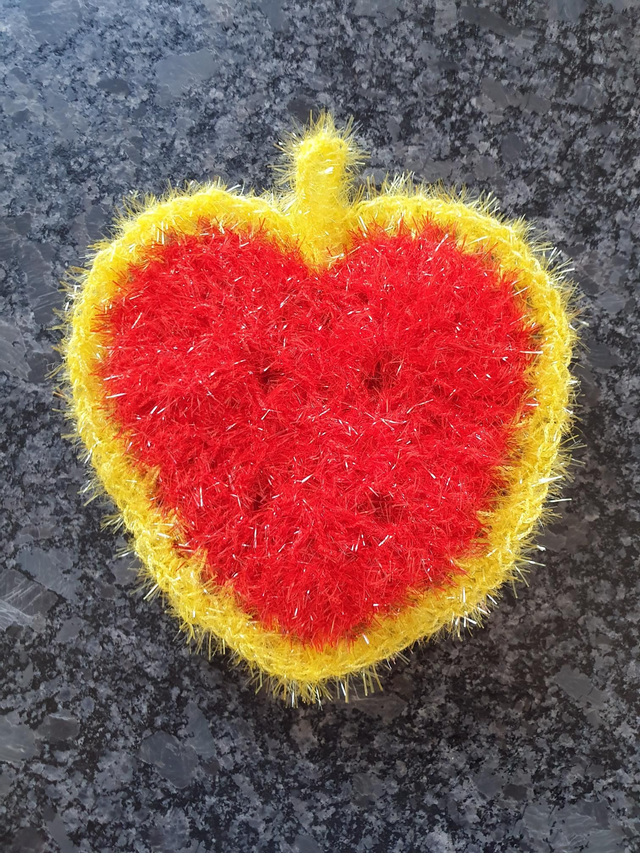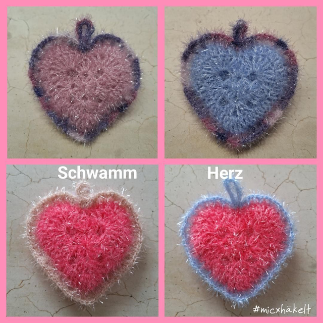 Jeder Schwamm ist ein Unikat und aus Bubble Garn, 100 % Polyester, gehäkelt.