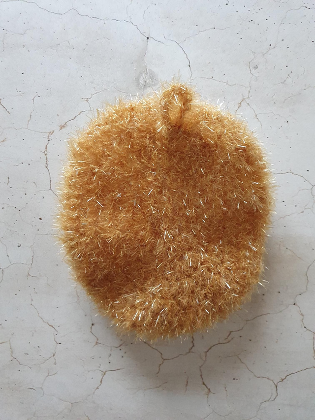 Jeder Schwamm ist ein Unikat und aus Bubble Garn, 100 % Polyester, gehäkelt.