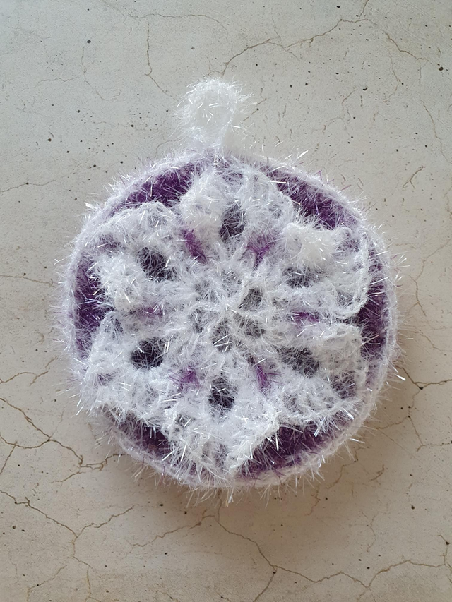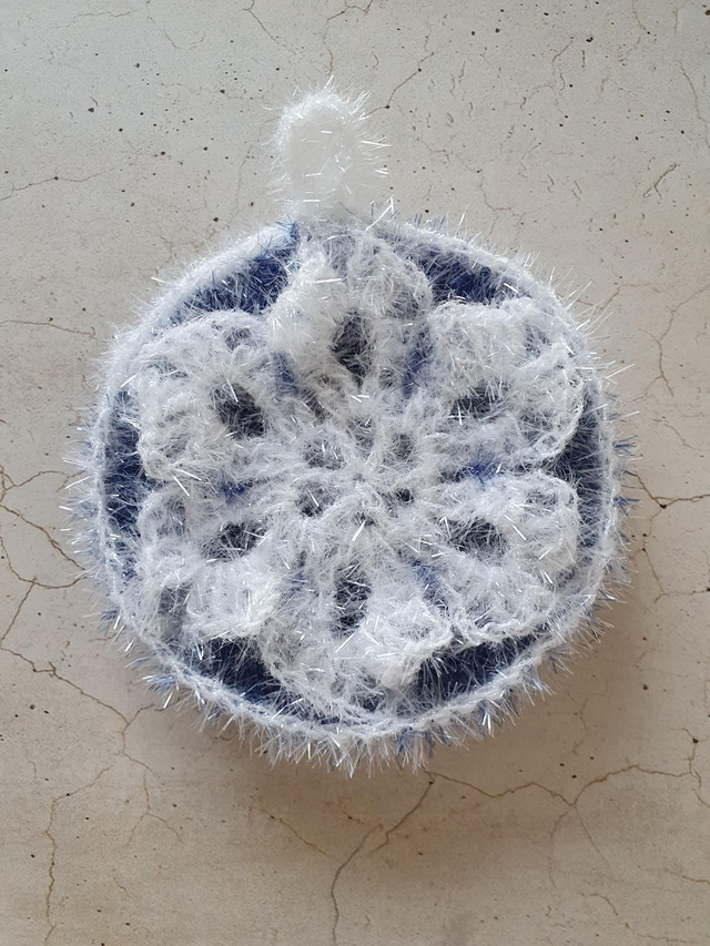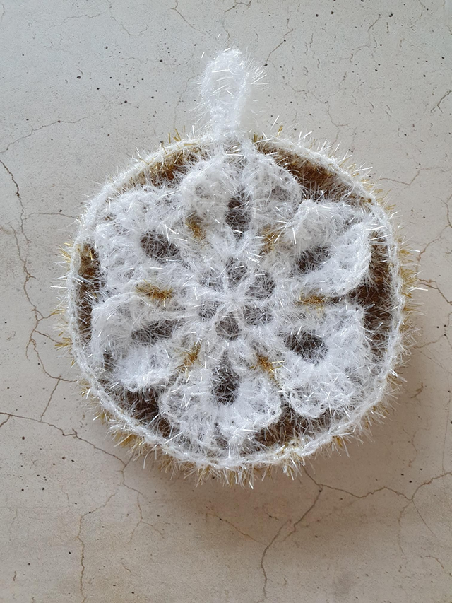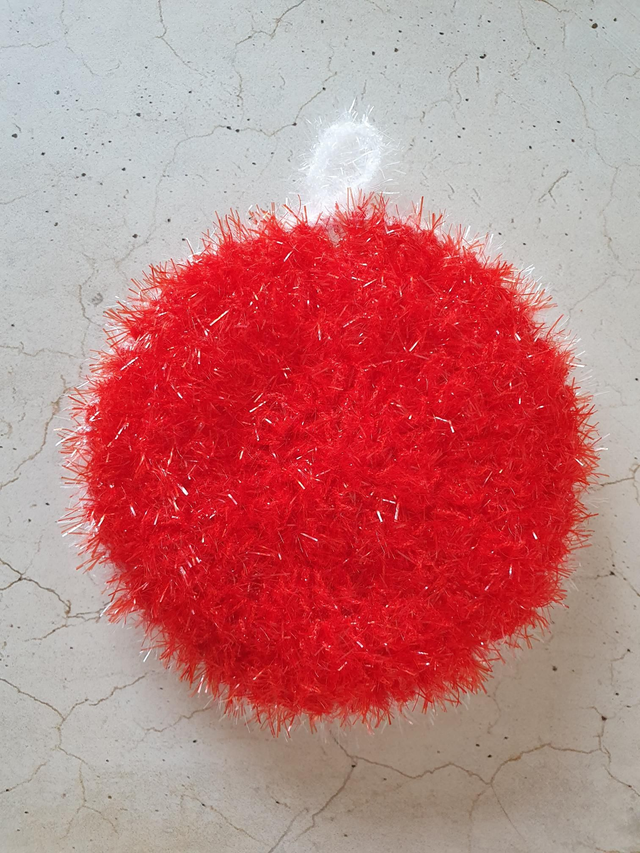 Jeder Schwamm ist ein Unikat und aus Bubble Garn, 100 % Polyester, gehäkelt.