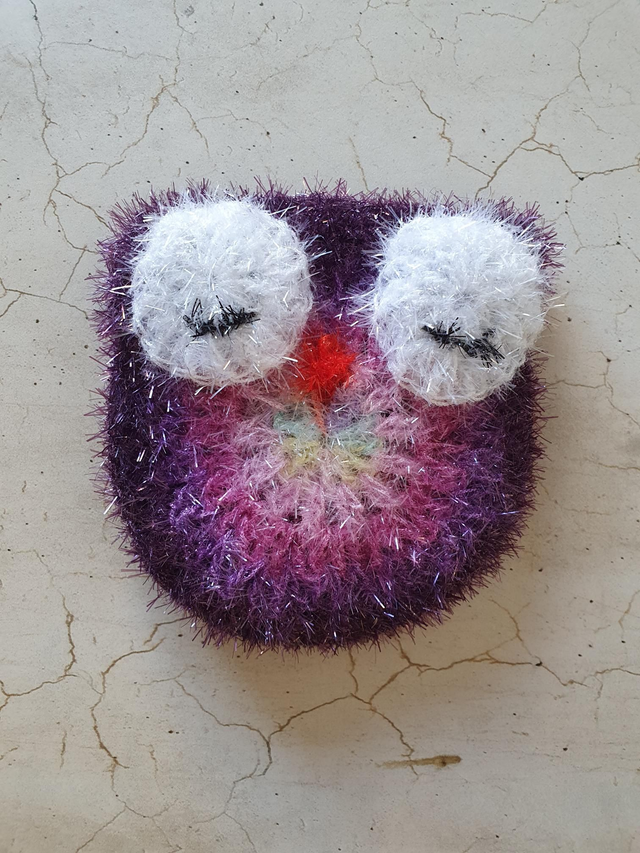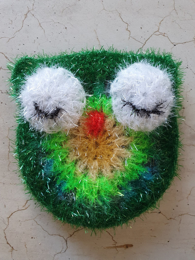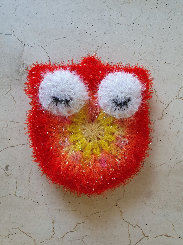Jeder Schwamm ist ein Unikat und aus Bubble Garn, 100 % Polyester, gehäkelt.