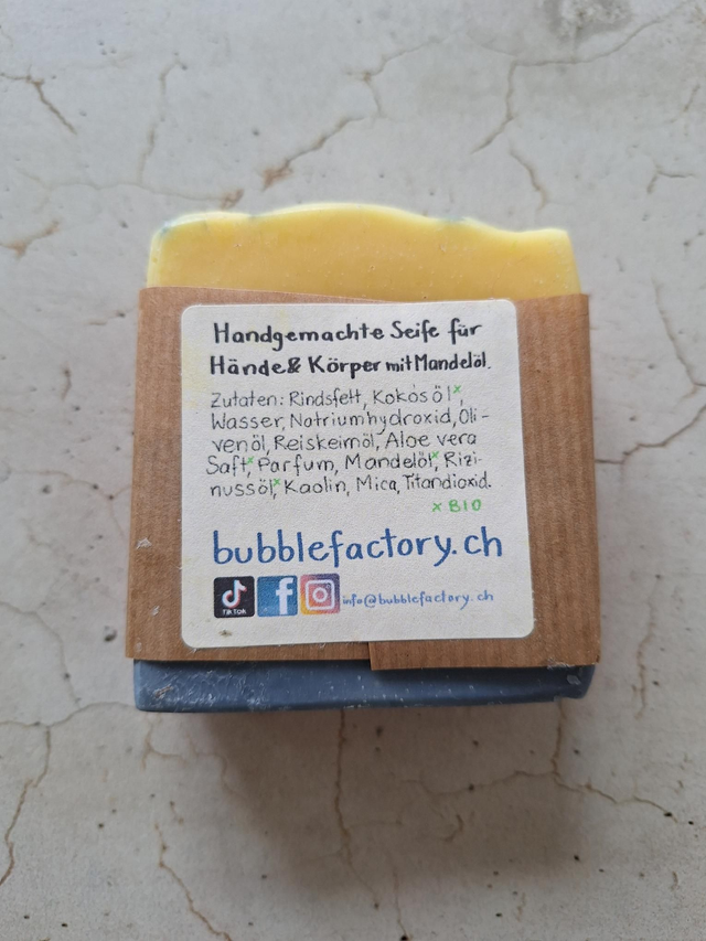 Rindsfett aus Ramsen (SH), Bio-Kokosfett, Wasser, Natriumhydroxid, Olivenöl, Reiskeimöl, Bio- Aloe vera Saft, Bio-Mandelöl, Parfum, Bio-Rizinusöl, Kaolin, Mica, Titandioxid.