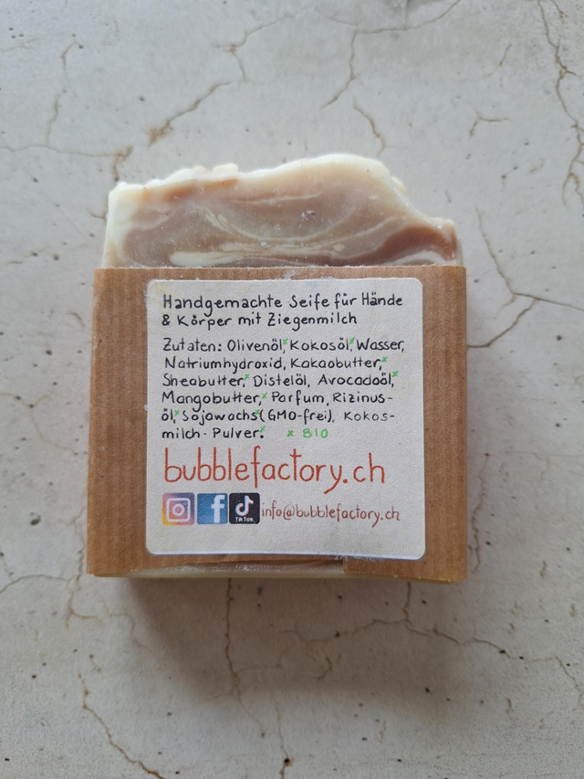 Olivenöl*, Wasser, Kokosöl*, Natriumhydroxid, Kakaobutter*, Sheabutter*, Distelöl, Avocadoöl*, Mangobutter*, Parfum, Rizinusöl*, Sojawachs* (GMO-frei), Kokosmilch-Pulver*. *Bio