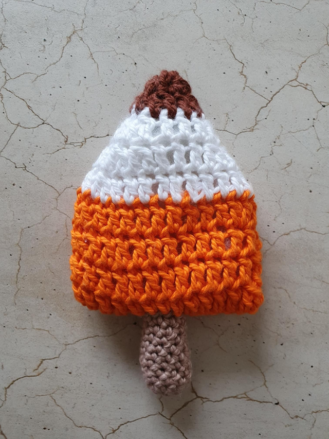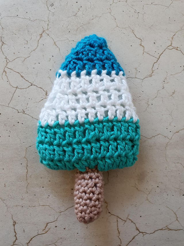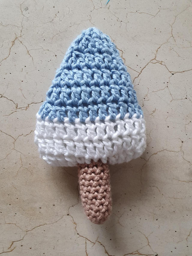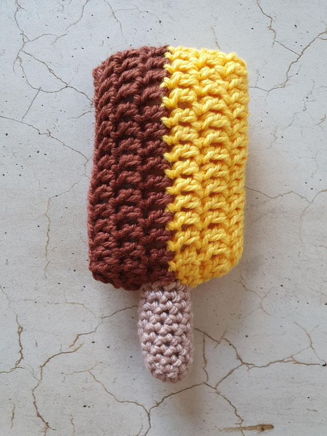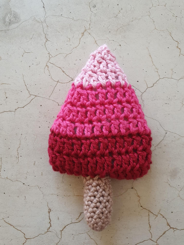 Dieses Spiel Eis am Stiel ist ein Unikat und aus Tissa-Garn, 100 % Baumwolle, gehäkelt und mit silikonisierter Füllwatte von IRIS gefüllt.