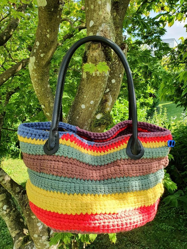 Aus Tube Cotton Garn (100 % Baumwolle aussen, 100 % Nylon innen), Kunstledertaschengriffe (60 cm)