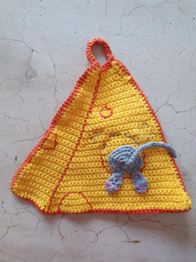 1x Topflappen Käse mit Maus, gelb/mandarine/grau/weiss/schwarz/rosa (Dreieckig Breite 6 - 23 cm x 20 cm)